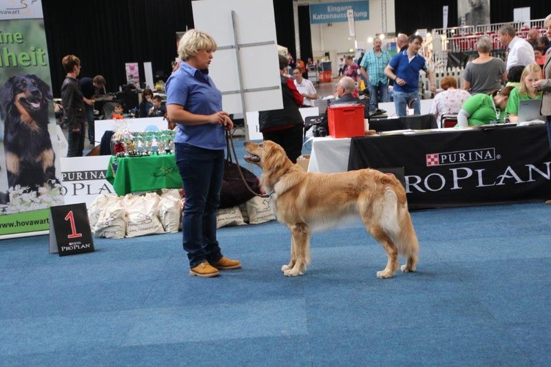 Ein tolles Ambiente, Hovawarte wohin man guckt und Hovawart begeisterte Menschen aus der ganzen Welt. Ich hatte entschieden, Oskar in der Gebrauchshundeklasse zu melden, als 17. Rüde. Das gab es auch noch nie. Aber an dieser Ausstellung gab es viele "das gab es noch nie"-Meldezahlen. Oskar hat sich sehr schön gezeigt und konnte sich in der ersten Bewertungs-Runde mit einem V von Richterin Kirsten Wesche unter die ersten 4 rangieren.