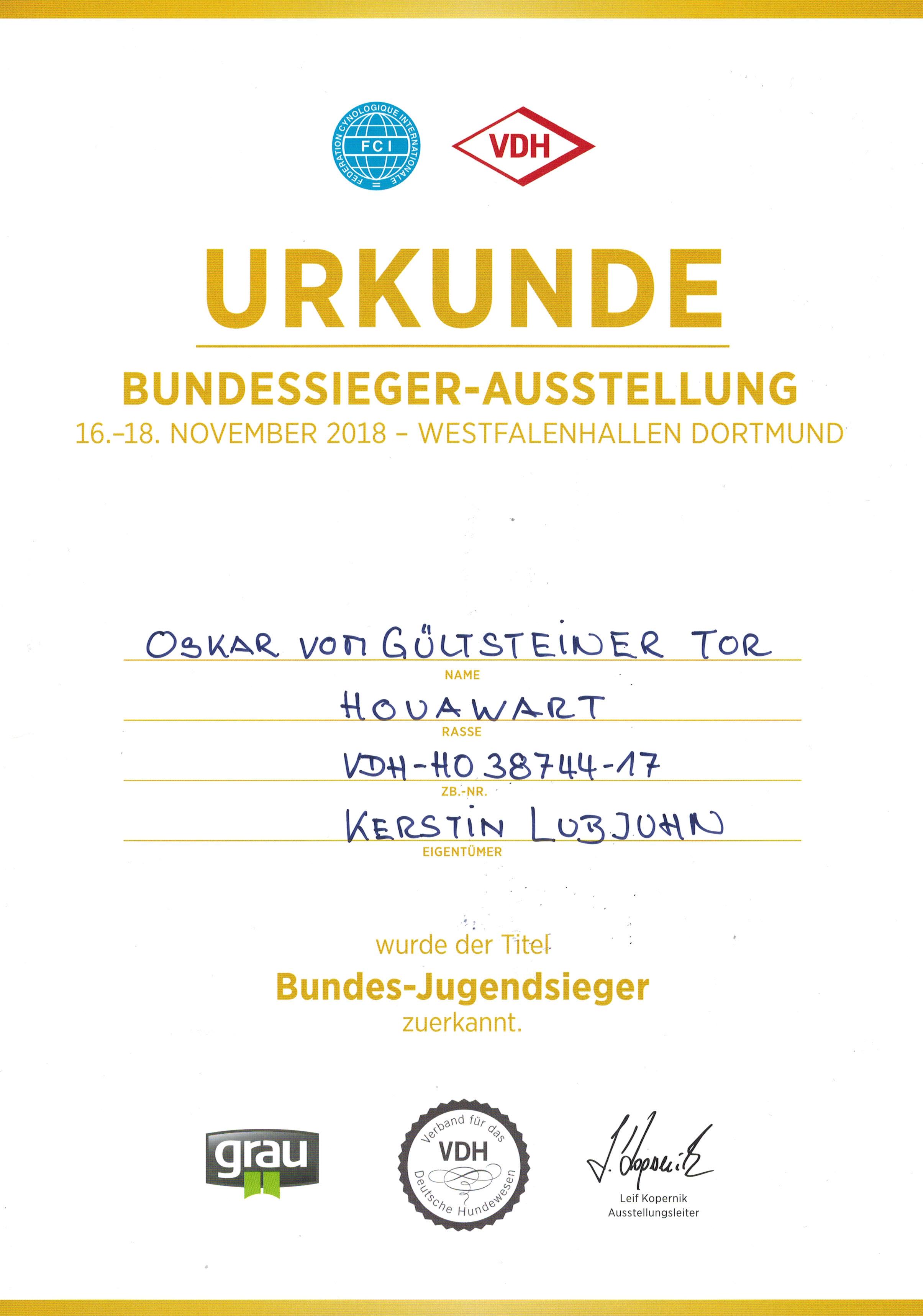 Am Freitag, den 16.11.2018 waren wir in Dortmund auf der CACIB und haben Oskar das letzte Mal in der Jugendklasse ausgestellt. Er hat von Richter Herrn Eickhoff ein V1 bekommen und einen sehr schönen Bericht. Damit wurde er "Bundesjugendsieger 2018" und er wurde auch "schönster Junghund". Somit beenden wir unser Ausstellungsjahr 2018 und Oskar hat jetzt alle Anwartschaften für den Titel "Dt. Jungendchampion VDH".